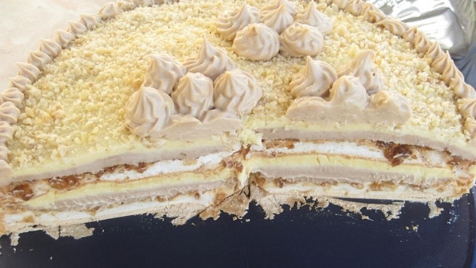 Peći na 150 C sat i pol. Kad je kora pečena okrenuti je, skinuti papir za pečenje tako da lješnjaci budu gore. Isto ponoviti i sa drugom korom. Umutiti žumanjce sa šećerom, i tome dodati gustin, puding od vanilije i 3 dl mlijeka i nastaviti mutiti da ne bude grudvica.