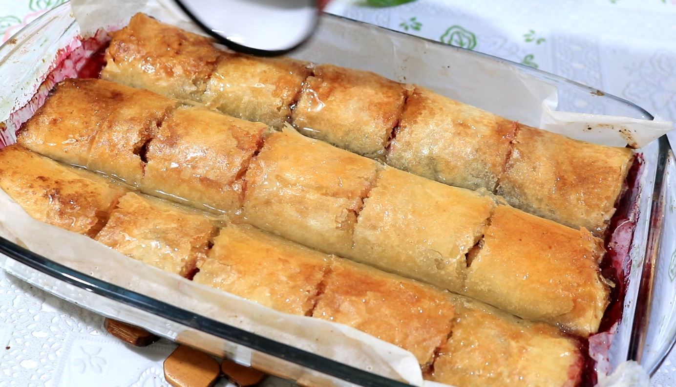 Najbolje ako imate pumpicu sa prskalicom. . Četiri kore tako sastaviti jednu preko druge i na zadnju u dnu poredjati po želji višnje i uviti.