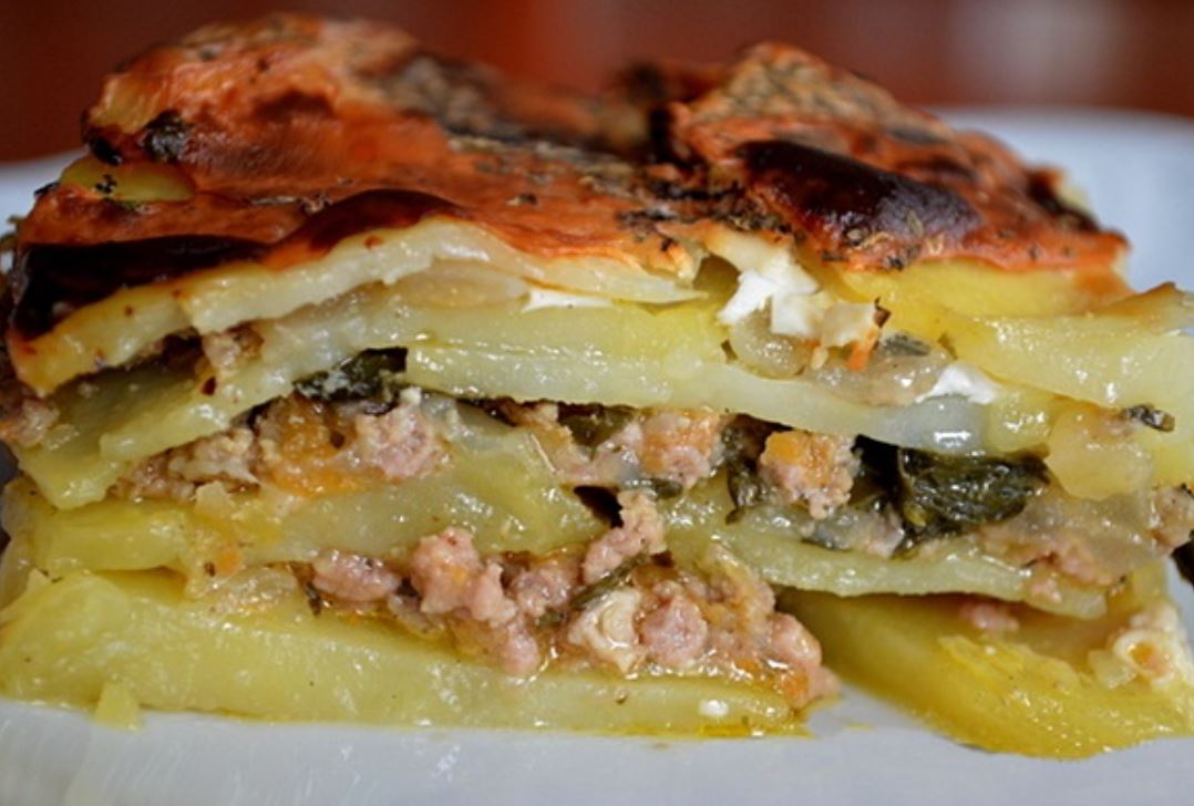 Kada je meso prženo dodajemo sitno iseckanu blitvu predhodno blanširanu. U podmzanu vatrostalnu posudu ređati red krompira iseckanog na kolutove, pa red smese sa mesom, i sve tako dok se smesa ne portroši, a na kraju treba da je krompir.