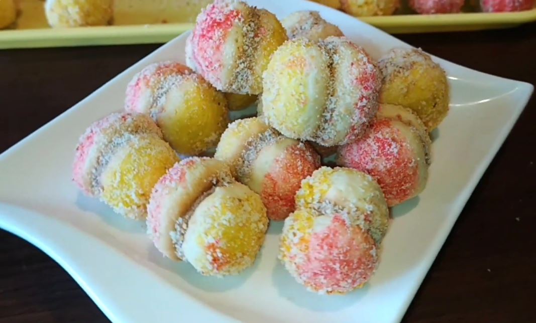Zatim ćemo od testa praviti loptice veličine većeg lešnika i redjati u tepsiju sa razmakom izmedju loptica. Peći na 200 C 15 min. Zatim izdubiti lagano nožem sredinu kolačića. Dobijene mrvice izvučene od sredine kolačića prosejati kroz sito pa zatim polovinu dobijenih mrvica koristiti za fil a polovinu mrvica koristimo za valjanje breskvica.