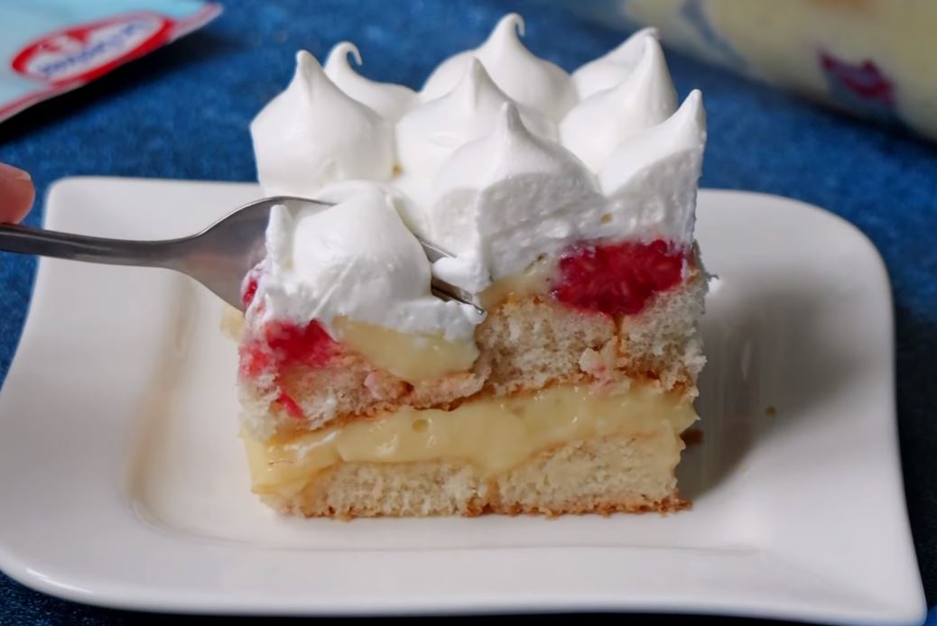 Za piškota kolač sam koristila krem puding od vanile koji se ne kuva, pa je zato ovaj kolač je napravljen za tili čas. Kao kontrast u ukusu sam koristila maline koju daju notu svežine ovom divnom kolaču.