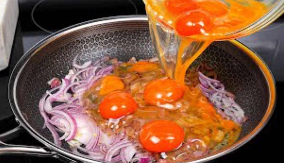 Priprema: Crveni luk isecite na brkove pa propržite u tiganju sa maslinovim uljem. Dodajte biber i so i pržite na laganoj vatri uz povremeno mešanje. U činiji razbijte jaja, ali ih nemojte mutiti već ih tako sipajte preko omekšalog luka. Dodajte seckan peršun, na kockice seckan kačkavalj, kašiku parmezana i slatku papriku. Sada sve promešajte pa poklopite i pržite 5-10 minuta.