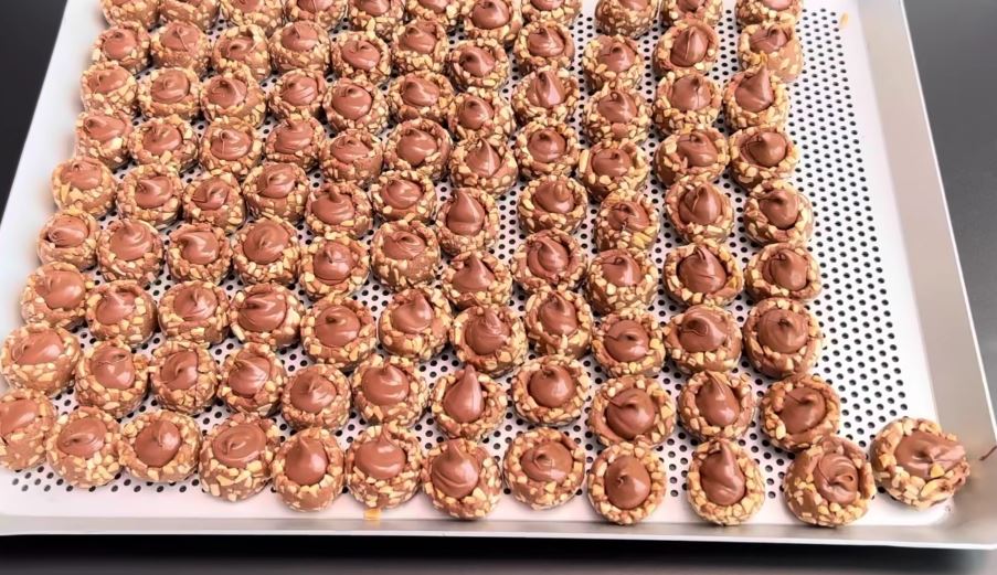 Uzmite malo smese, oblikujte lopticu, a zatim je uvaljajte u seckani lešnik.Rukama napravite rupu u sredini i ređajte na pleh obložen pek papirom. Stavite u frižider na pola sata, a zatim pecite u zagrejanoj rerni na 150°C oko 25-30 minuta. Kesu za zamrzivač napunite nutelom i isecite manju rupu. Sipajte nutelu u kolač. Prijatno!