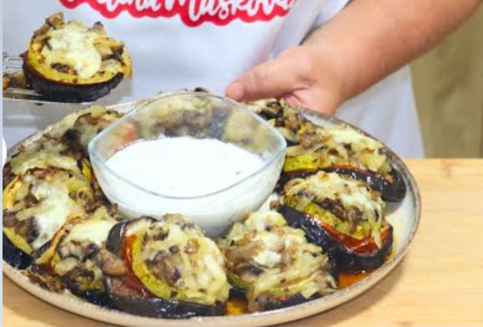 Nanesite preko ispečenog patlodžana, paradajza i tikvice i vratite na još 10min. u rernu.