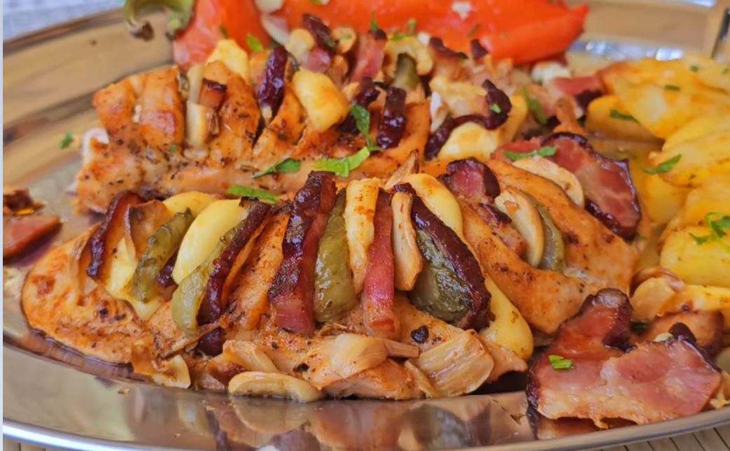 Meso iseći po širini kao harminiku. Utrljati začine za piletinu i u prosečeni deo ubaciti listove dimljene slanine listove kačkavalja i listiće krastavčića. Na kraju rasporediti listiće belog luka. Utrljati začine za piletinu i u prosečeni deo ubaciti listove dimljene slanine listove kačkavalja i listiće krastavčića. Na kraju rasporediti listiće belog luka. Možete malo pokriti na početku folijom pa posle otkriti da se lepo zarumeni. Kad se malo prohladi služiti uz krompiriće.