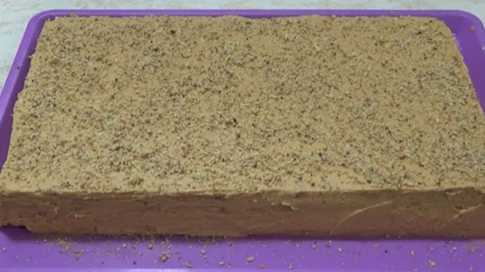 Keks umakati u sok i ređati na tacnu kao prvu koru. Preko keksa naneti prvi sloj fila. Preko fila poređati drugi sloj keksa umočenog u sok. Tako raditi do kraja, da bude četiri sloja keksa i četiri sloja fila. Ostaviti malo fila da se torta premaže sa strane. Tortu na kraju posuti mlevenim orasima i staviti u frižider da se dobro ohladi.