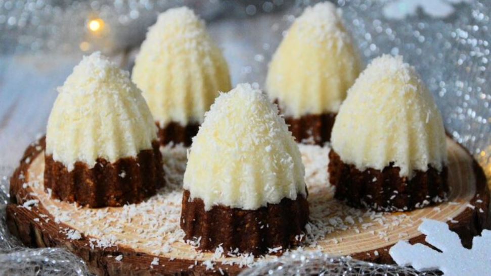 Uzmite cediljku za citruse i stavite kesu kako je prikazano u videu ili poprskajte uljem u spreju. Prvo stavite belu smesu, pa braon i dobro pritisnite. Okrenite kolač na tacnu i skinite cediljku i kesu. Kolač pospite kokos brašnom i ohladite u frižideru.