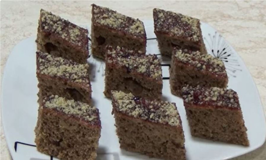 Pečen kolač premazati pekmezom od šljiva i posuti mlevenim orasima. Ostaviti kolač da se ohladi.