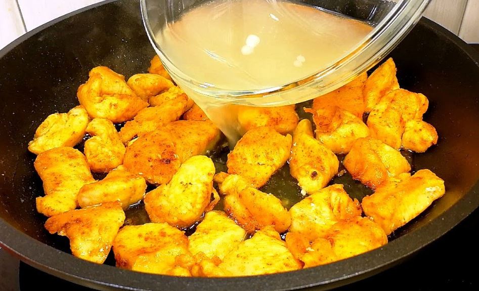 Stavite u tiganj da se prži. Za to vreme pomešajte sok od limuna sa medom i čašom bujona (možete rastvoriti kocku za supu).