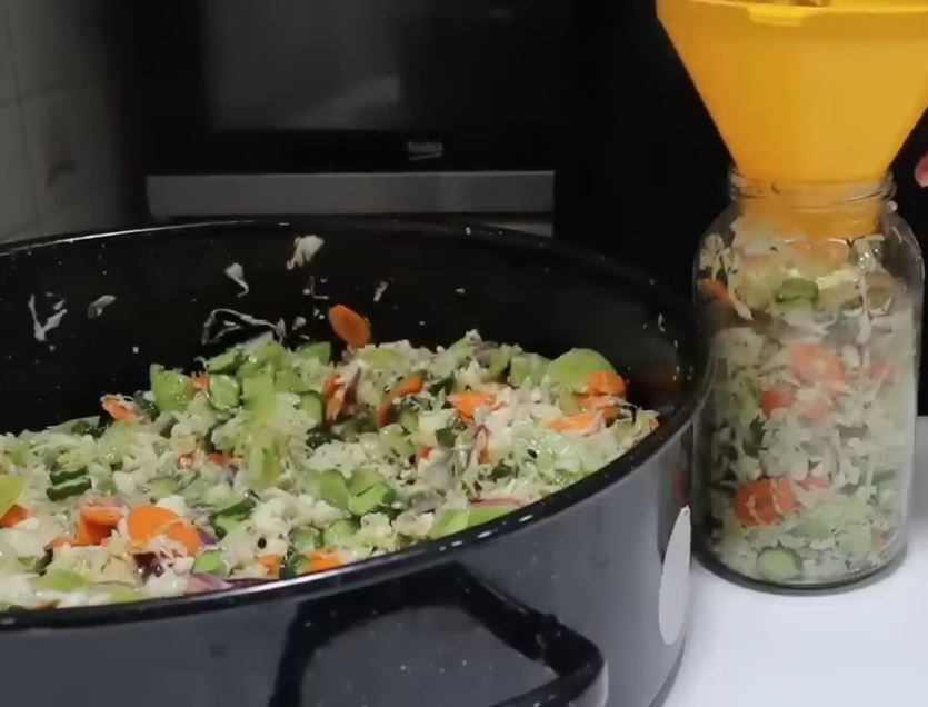 Odaberite povrće koje vam se dopada i koje volite, sve to izrežite na sitnije kao za šarenu saltu. Na 5kg. povrća: