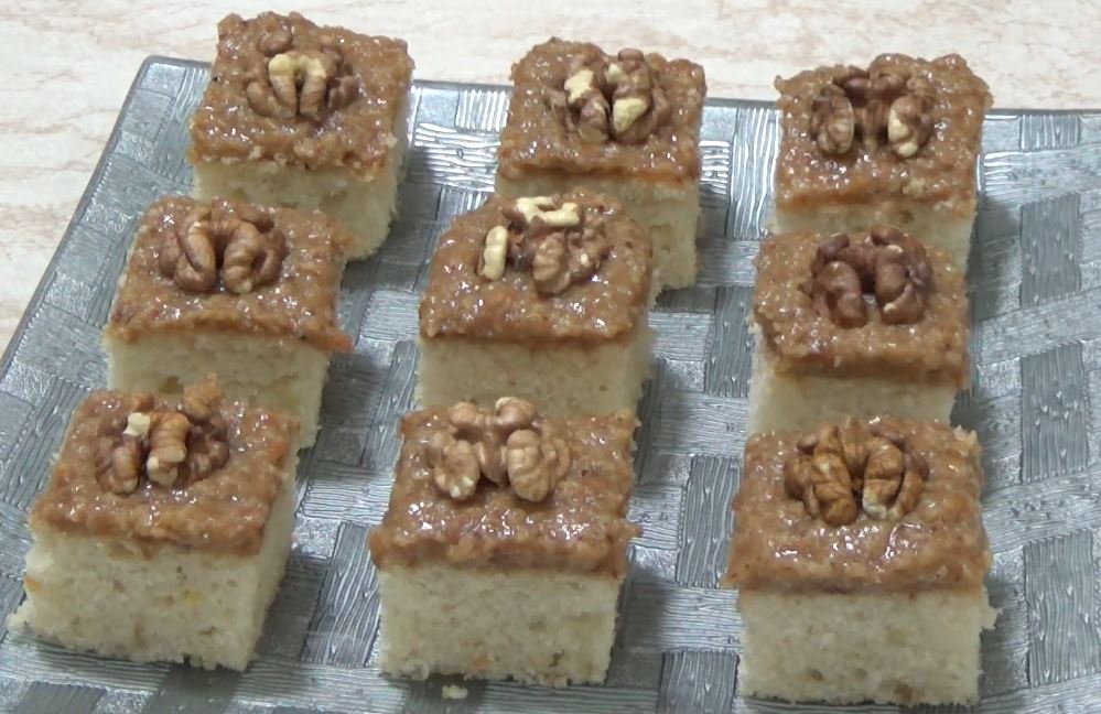 Kolač iseći na kocke i svaku kocku dekorisati polovinom jezgra oraha.