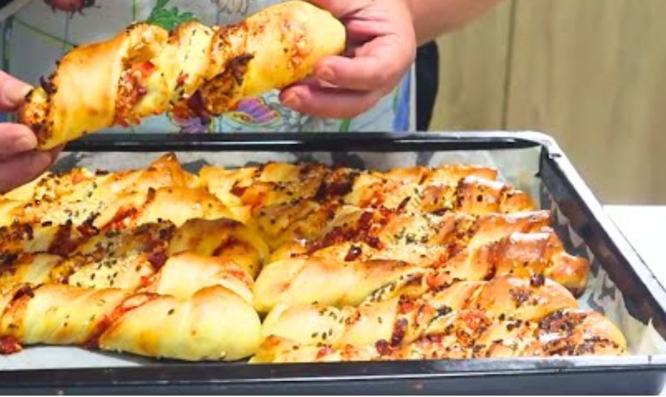 Rezati trake, uvijati pa ređati u pleh obložen papirom za pečenje.
