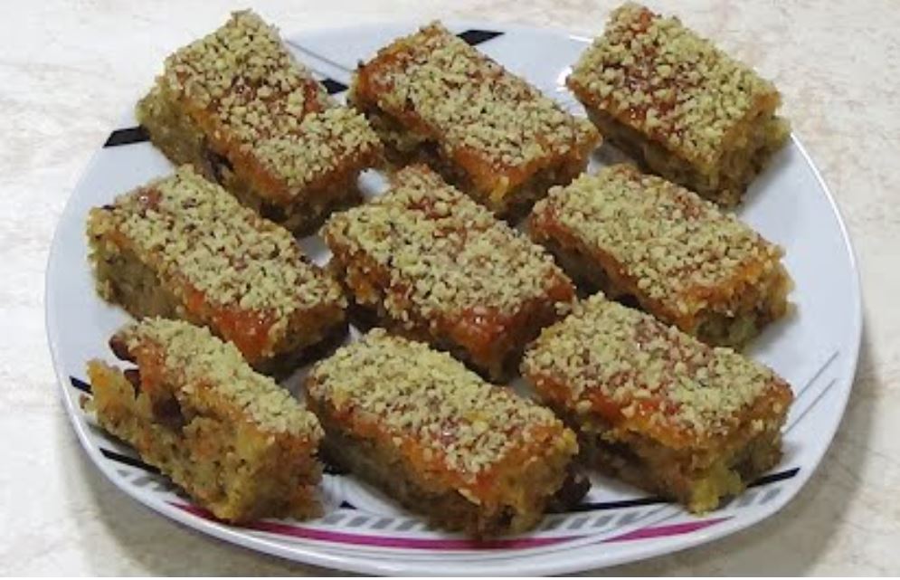U pleh dimenzija 24 x 34 cm na papir za pečenje izručiti smesu. Staviti u zagrejanu rernu na 200 stepeni da se peče 20 minuta. Preko vrućeg kolača premazati džem. Zatim kolač posuti mlevenim orasima i ostaviti na sobnoj temperaturi da se ohladi.