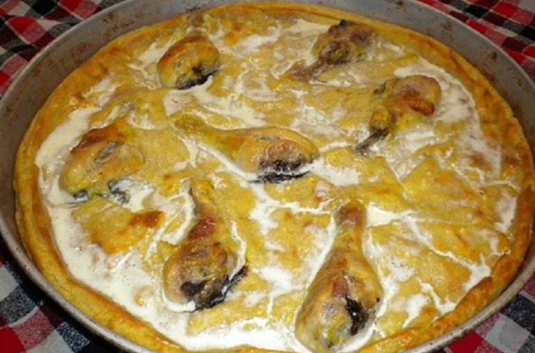 Na toplo ulje izlijte trećinu pripremljene smjese od jaja i brašna. Na to rasporedite popečeno meso, a po mesu izlijte preostalu smjesu od jaja, brašna i mlijeka. Pecite u pećnici zagrijanoj na 210°C, 20-30 minuta. pečenu kvrgušu malo ohladite, narežite, poslužite uz salatu.