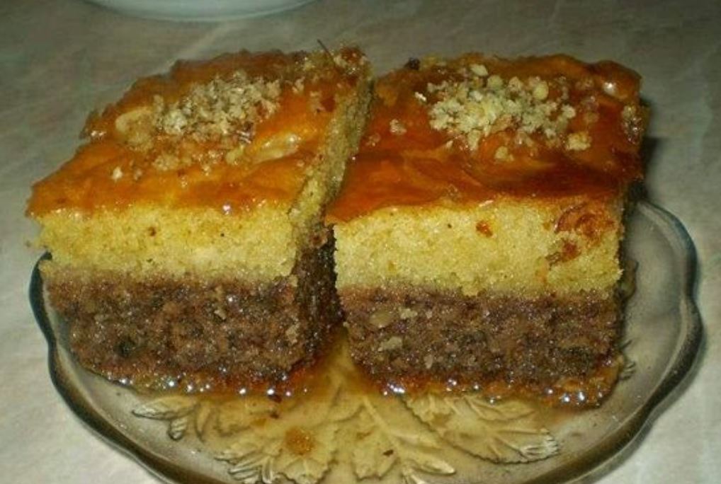 Skuvati sirup od šećera, vode i limuna sečenog na kolutove (ne dugo, nekoliko minuta). Vrućim sirupom preliti vruć kolač. Posuti mlevenim orasima.