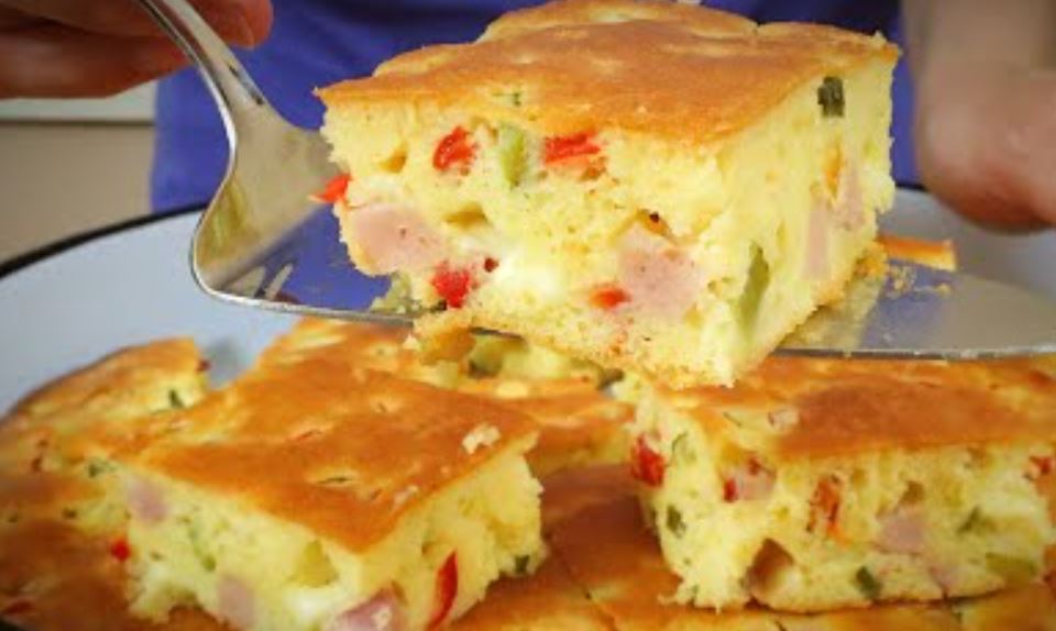 Način pipreme: Iseckajte šunku, kačkavalj, krastavčiće i kiselu papriku. Jaja umutite, pa dodajte jogurt i ulje, a zatim i brašno, so i prašak za pecivo. Izmešajte sve, pa dodajte seckano povrće i šunku. Izmešajte sve pa istresite u tepsiju i pecite na 200 stepeni Celzijusa oko pola sata.