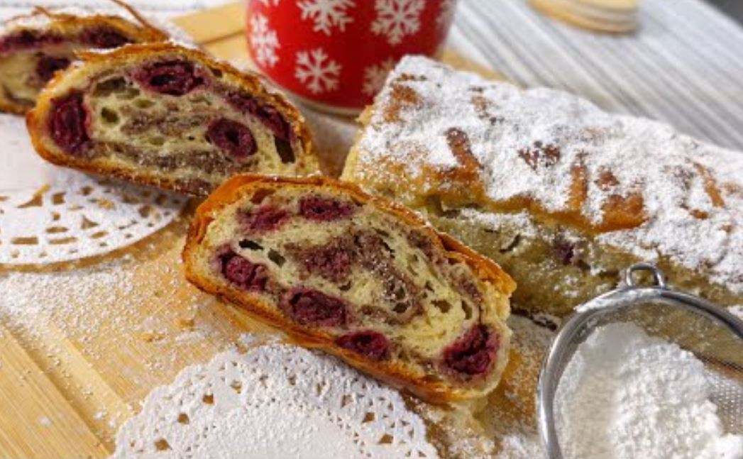 Jedinstveni spoj namirnica koji će osvojiti vaše čulo ukusa. Ne oduzimajući vam puno vremena u pripremi, napravite preukusnu poslasticu. Štrudla od gotovih kora sa višnjama i mlevenim orasima. Tako lepog i dekorativnog izgleda, koja će ukrasiti vašu trpezu. Pogodna štrudla za sve vrste slavlja i proslava. Napravite i iznenadite vašu porodicu i prijatelje.