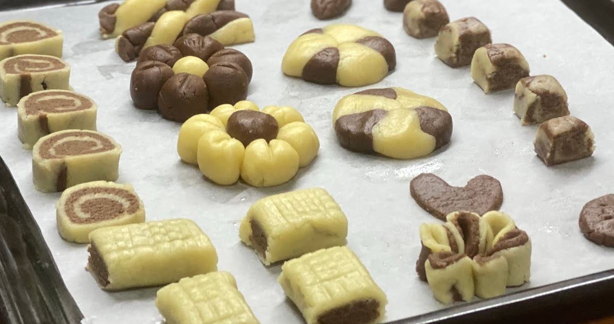 Priprema: Umutite maslac i šećer, a onda dodajte brašno. Dobijeno testo razdvojite na dva različita dela. Jedan deo ostavite takav kakav jeste, a u drugi deo dodajte kakao. Dobijeno testo uvijte u dve folije pa ostavite u frižideru da se odmori oko pola sata, a može i više.