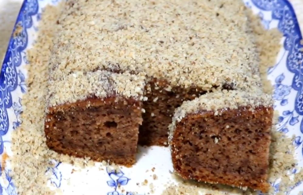 Potrebno je: 200 gr brašna; 100 gr šećera; 100 gr oraha + 50 gr; 400 ml kisele vode; 2 kašike džema; 1 prašak za pecivo.