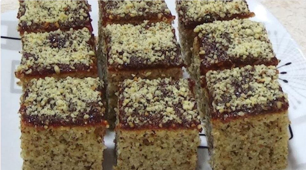 Pleh veličine 25×35 cm obložiti papirom za pečenje i izručiti smesu. Kolač peći na 200 stepeni oko 30 minuta. Kad se kolač ohladi, premazati ga džemom i posuti mlevenim orasima.