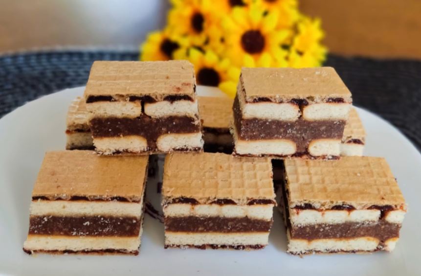 100 g šećera sa 100 ml vode otopiti na tihoj vatri, dodati 125 g margarina I 50 g čokolade. Kad se sve lepo otopili pomeriti sa vatre i dodati 1 kašiku kakaoa , 1 kašiku ruma, 70 g oraha i 150 g mlevenog keksa. Sve sjediniti i odmah premazati preko keksa. Preko smese ide još jedan red keksa a zatim još jedan list male oblande premazan džemom.