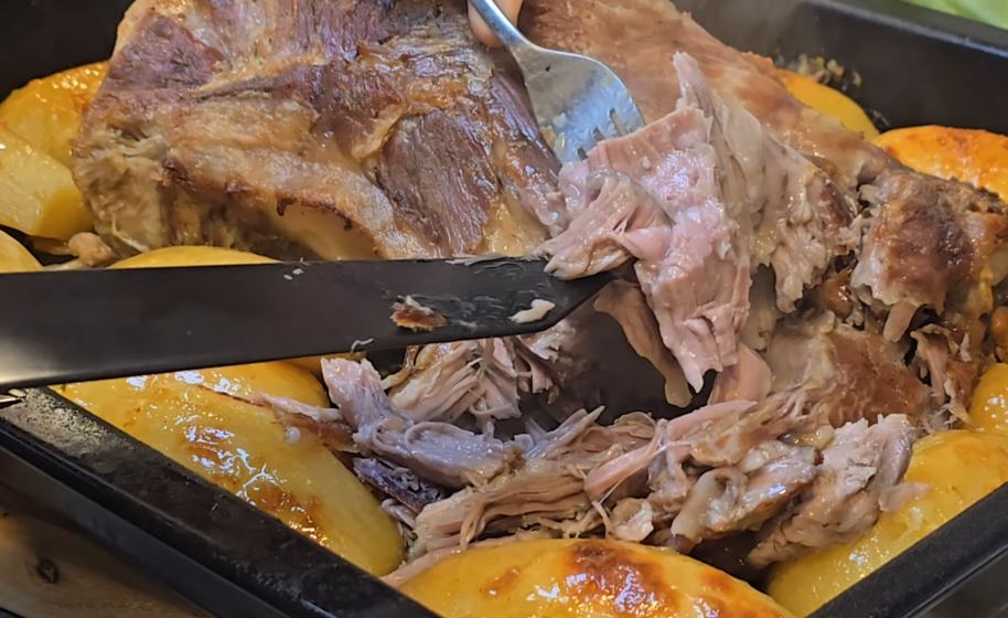 Posoliti meso i staviti suvi začin. Staviti u pleh premazati masnocom. Preliti meso uljem. Preko staviti pek papir pa aluminijumsku foliju. Peći 1.5h na 220 stepeni pa okrenuti meso. Pokriti meso i vratiti u rernu pi peći 30 min na 200 stepeni. Meso okrenuti posle 30 min, pa staviti krompir. Pokriti medo i peci 30 min na 210 stepeni. Skinuti foliju i okrenuti krompir I peći još 30 min bez folije na 200 stepeni. Ako želite možete jos peći 10-15 min i okrenuti krompir.