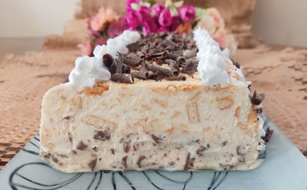 Umutiti 4 žumanaca sa 6 kašika šećera i 1 vanilicom, dok se šećer ne otopi . Kuvati par minuta na pari a zatim dodati 200 g bele čokolade. Kad se čokolada otopila ostaviti da se malo prohladi pa pomešati sa 500 ml umućene slatke pavlake. Podeliti na 2 dela. U prvi deo dodati seckanu mlečnu čokoladu a u drugi dodati mrvljeni keks.