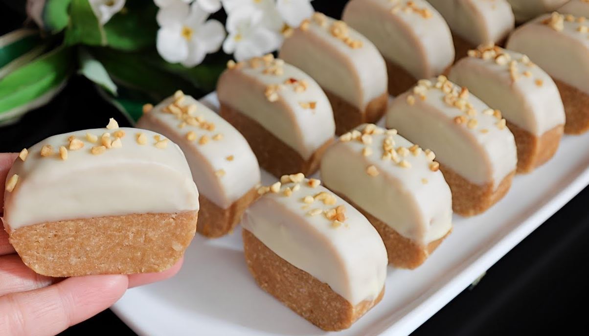 Priprema: Keks pomešajte sa izblendiranim kikirikijem, šećerom u prahu, rendanom korom pomrandže, cimetom i istopljenim puterom. Postepeno dodajte mleko i umesite testo. Zatim ga stavite na pek papir, oblikujte “salamu” i umotajte. Ostavite u frižideru 3 sata. Onda isecite parčiće, pa umočite do pola u istopljenu belu čokoladu. Ređajte na tacnu i vratite u frižider da se stegne. Pospite seckanim orasima.