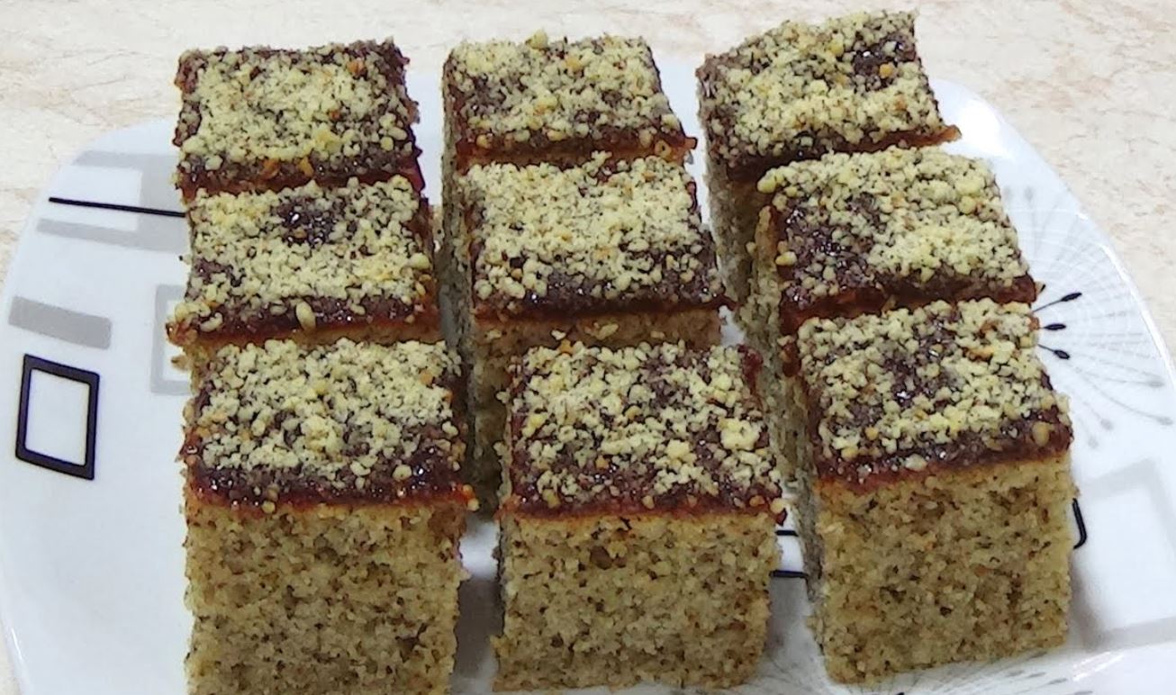 Pleh veličine 25×35 cm obložiti papirom za pečenje i izručiti smesu. Kolač peći na 200 stepeni oko 30 minuta. Kad se kolač ohladi, premazati ga džemom i posuti mlevenim orasima.