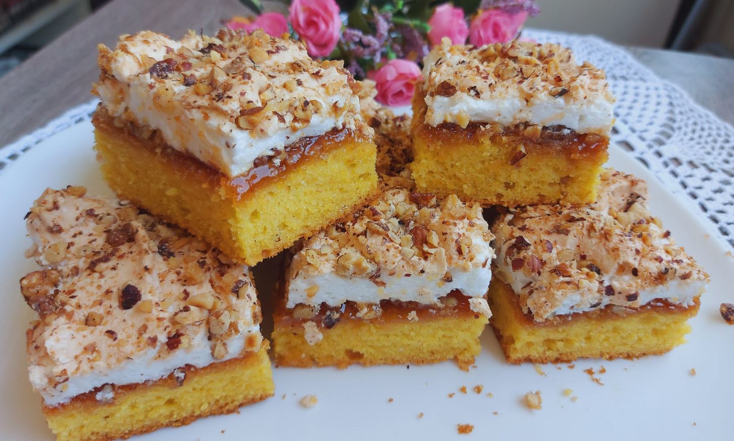 Izvaditi i premazati sa džemom i posuti sa 50 gr seckanih oraha i lešnika. Belabca umutiti sa šećerom dodati 2 kašike limunovog soka. Mutiti 5-6 minuta da se dobije čvrst šlag. Istresti na kolač preko džema i posuti ostatkom oraha i lešnika. Vratiti u rernu i peći još 30 min na 150 stepeni C. Ohladjen seći.