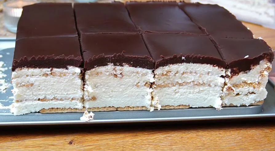 Jednostavan kremasti kolač od kokosa bez pečenja. Odlična poslastica koja se brzinski i bez muke radi jer je potrebna samo jednostavna krema od kokosa, petit keksi i čokoladna glazura.