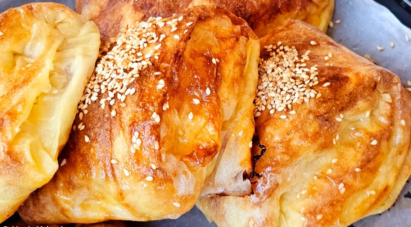 Uvijati za oko tri prsta širine pa premazati nadevom jaja. Saviti tri puta kao u paketić i redjati u pleh obložen pek papirom, Premazati ostatkom nadeva odozgo posuti po želji susamom.