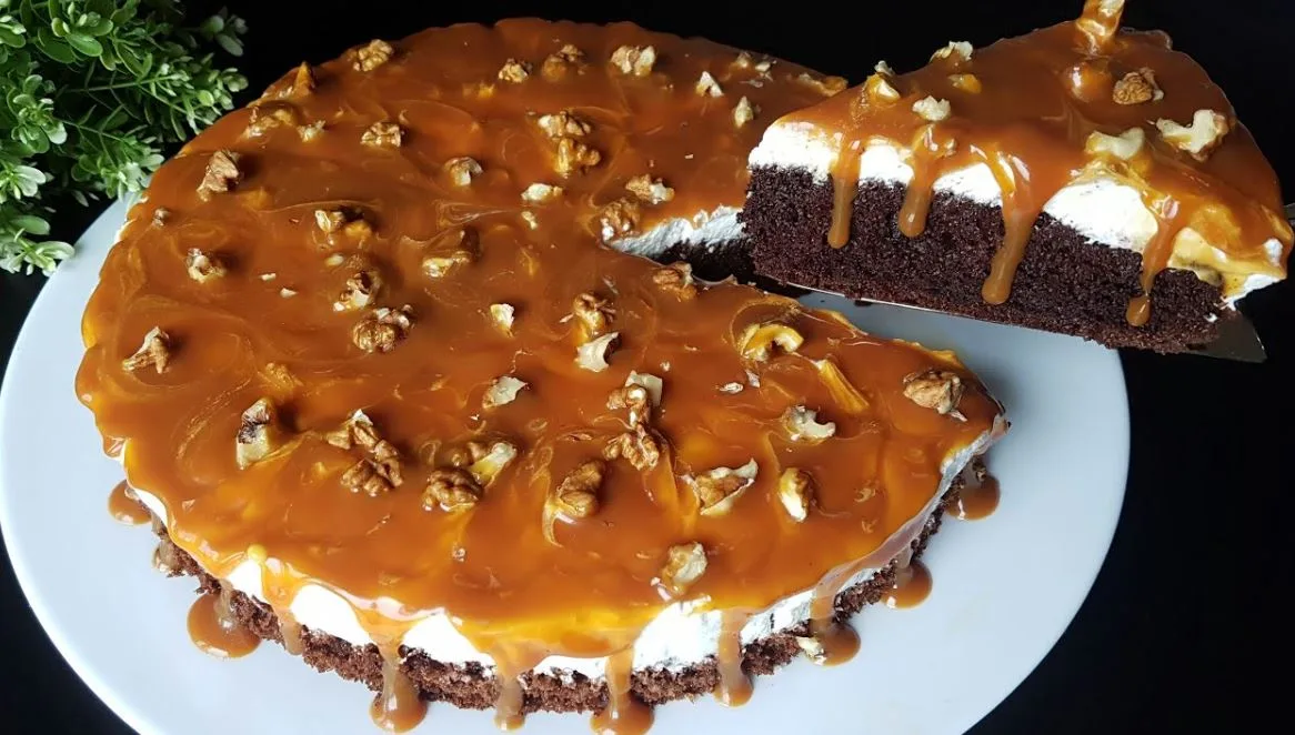 Prohladite, pa prelijte preko torte sa koje ste skinuli kalup. Odozgo poređajte seckane orahe.