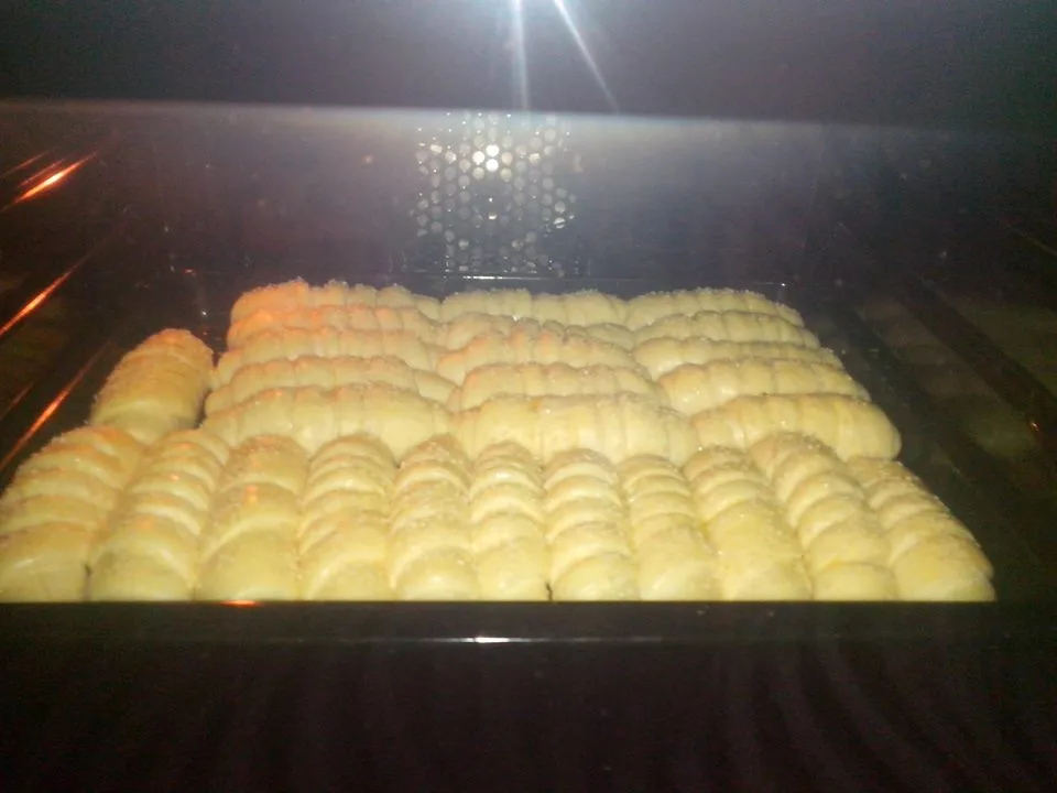 Svaku kuglicu razviti u duguljastu elipsu i slagati u pleh obložen papirom za pečenje.