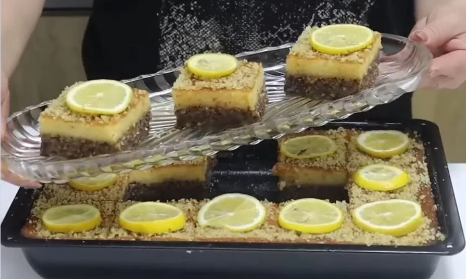 Vruć kolač preliti sa vrućim prelivom i posipati mlevenim orasima. Ostavite da se ohladi par sati.