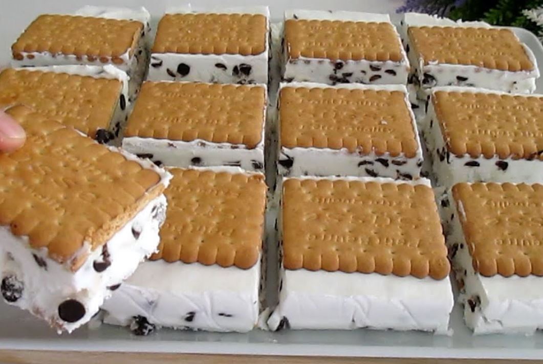 Potom dobijenu smesu sipajte preko keksa u plehu i ravnomerno razmažite, pa odozgo složite još jedan sloj keksa. Prekrijte odozgo providnom folijom i ubacite u zamrzivač dok se skroz ne smrzne i ne dobije formu keks sladoleda.