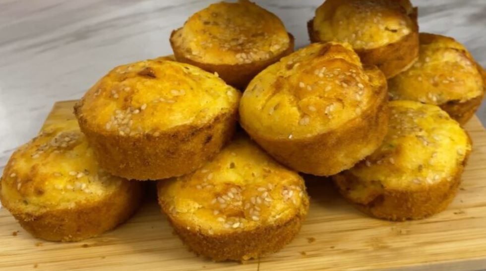 Sve sastojke sjediniti i umutiti, sipati u kalupe, posuti susamom i peći na 200°C dok ne porumeni.