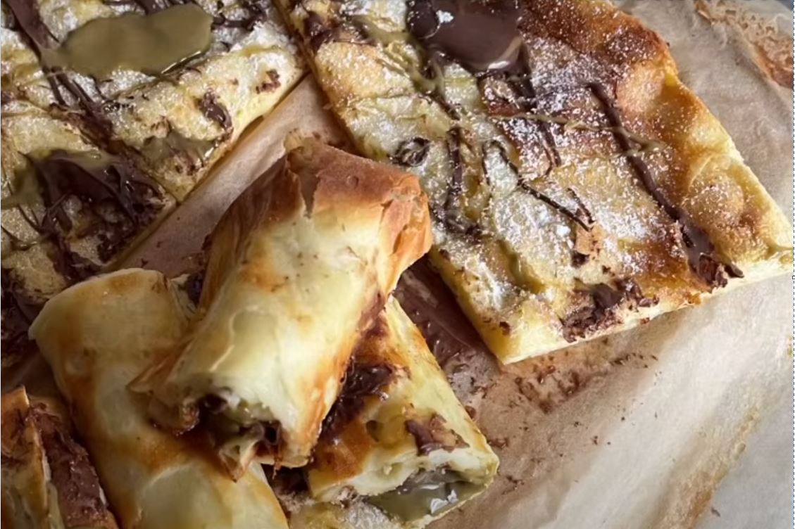 Pritisnuti napuhane dijelove tijesta, posuti ga šećerom u prahu, nutellom i pastom od pistacija.