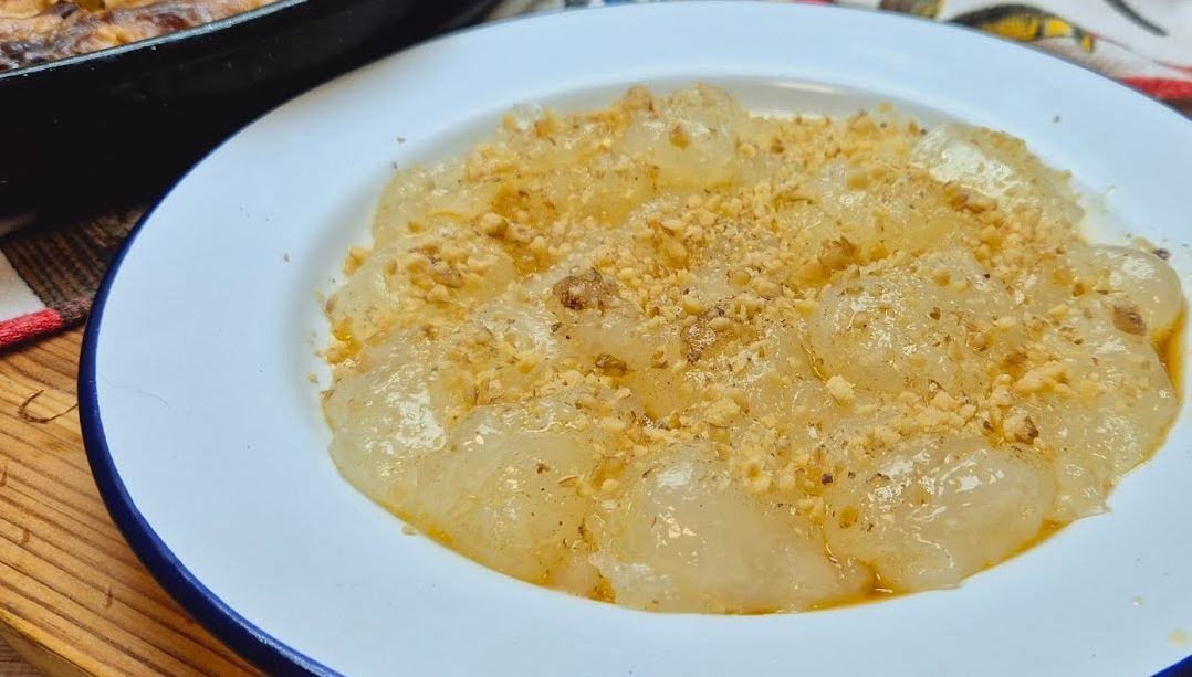 zatim sipati pomjesan gustin. Kad se s gusnulo skloniti sa vatre. Na jedan tanjir sipati malo otopljenog maslaca,posuti mljevenim orasima pa kasikom vaditi i redati cicvaru. Odozgo ponovo politi sa otopljenim maslacem i orasima. Jesti mozete odmah dok je vruce ali i hladno.