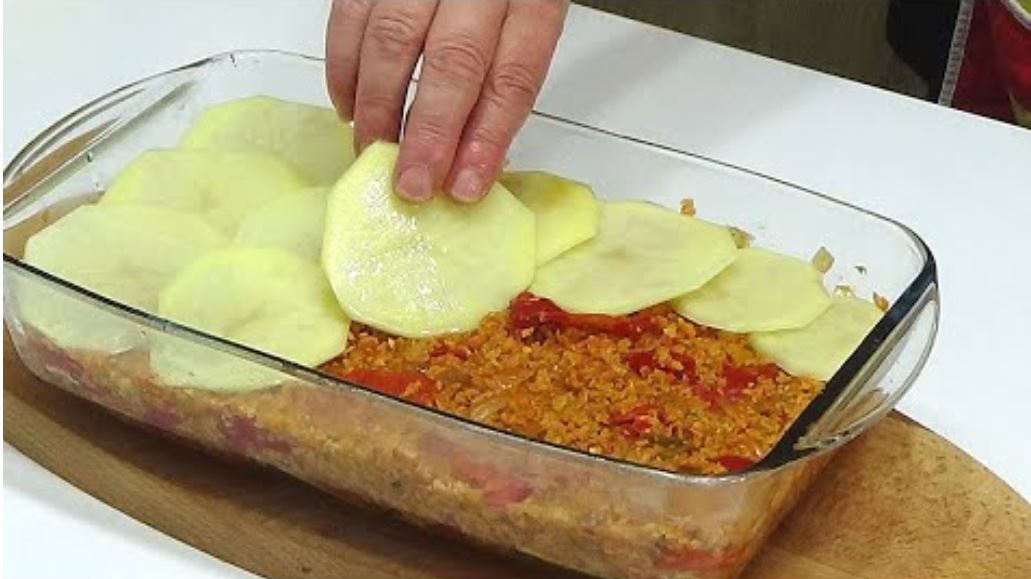 Propženom liku dodajte sos od paradajza, paprikui sojine ljuspice, sve to lepo zašinite i rasporedite preko narezanog krompira. Preko poređajte ponovo kolutove krompira nalijte vodom i preko premažite mešavinom od ulja, crvene mlevene paprike i bibera.