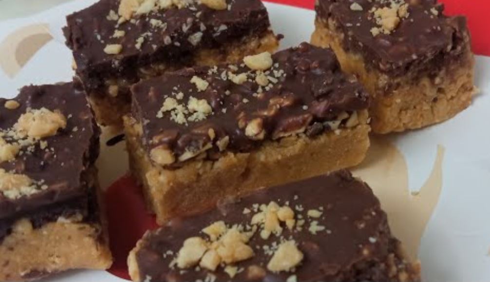 250g margarina umutite sa 200g šećera u prahu, dodate 200g kikirika i 200g mljevenog keksa. U pleh formirate podlogu od ove mase, zagladiti pa premazati sa 3 supene kašike meda, posuti sa 150g kikirika i sa nekih 50g sjeckane čokolade. Preko svega na kraju preliti istopljenu čokoladu.