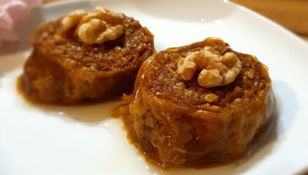 Pripremite fil od mlevenih oraha, keksa i šećera, premažite kore rastopljenim maslacem i uljem, pospite filom, urolajte i secite na kolutiće, slažite u pleh, pecite do zlatne boje, prelijte vrućom agdom od šećera, vode i limuna, pa ostavite da upije i uživajte u sočnim ružicama sa orasima.