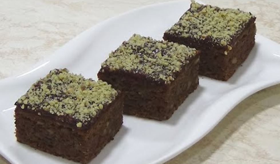 Pomešati brašno sa praškom za pecivo. Dodati šećer, kakao prah, cimet, sodu bikarbonu i izmešati. Potom sipati kiselu vodu i zamutiti. Dodati džem i umešati. Na kraju dodati seckane orahe i rendane jabuke i dobro izmešati. Smesu sipati u pleh (20 x 30 cm) obložen papirom za pečenje. Staviti u rernu zagrejanu na 200 stepeni i peći 40-50 minuta. Vruć kolač premazati džemom i posuti mlevenim orasima. Ostaviti da se ohladi.