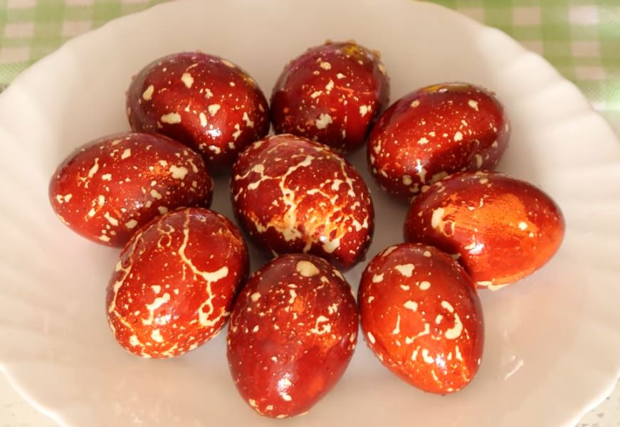 Skuvajte bela jaja sa ljuskom crnog luka, kašičicom soli, malo sirćeta i vodom, a nakon kuvanja ih istrljajte parafinskom svećom da dobiju jedinstveni “galaksija” sjaj bez ikakvih veštačkih boja.