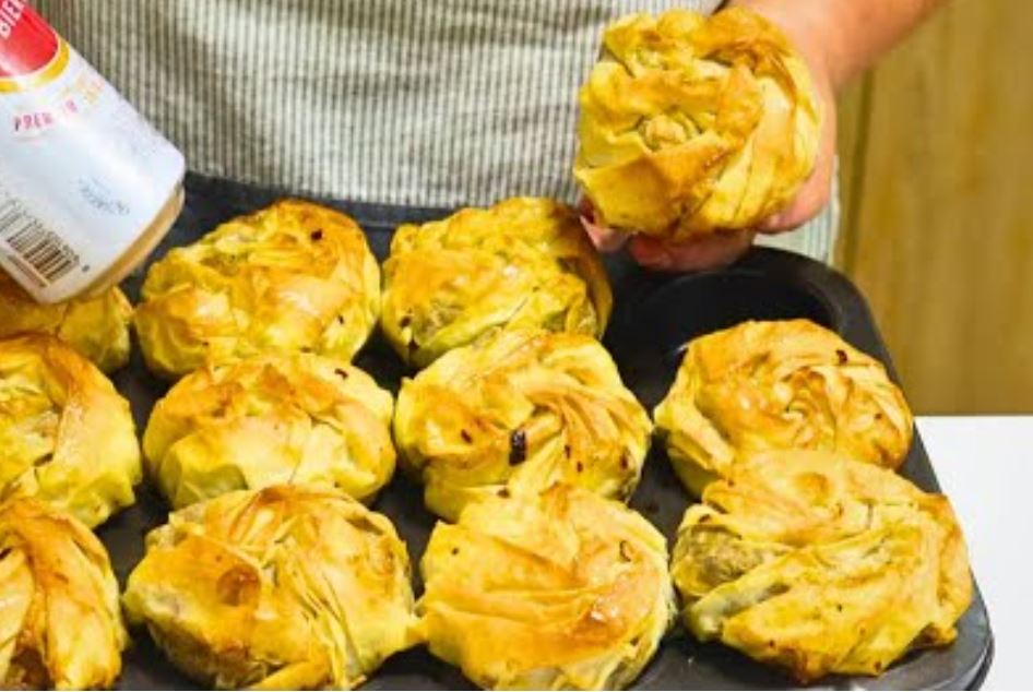 Pripremite fil od praziluka, šampinjona i krompira, nanesite ga na kore, urolajte u ružice, stavite u kalup za mafine, premažite pivom.