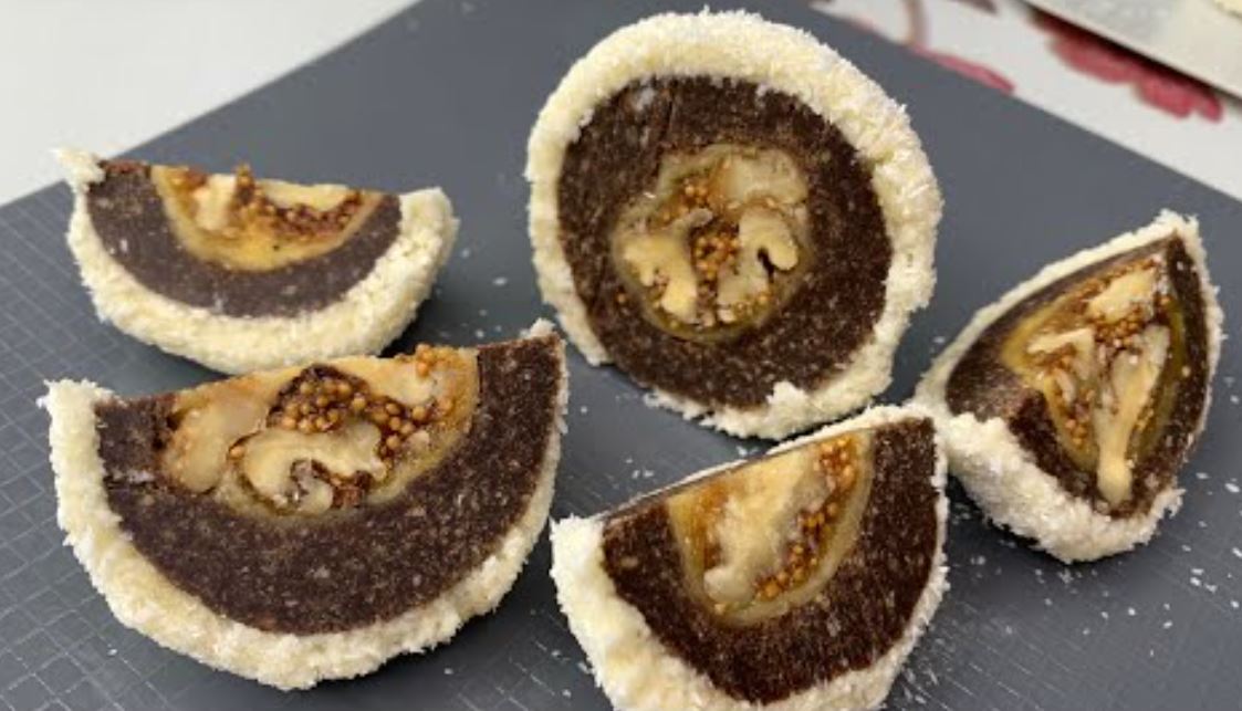 Skuvajte belu i smeđu masu od navedenih sastojaka, uvaljajte punjenje od smokvi i oraha u slojeve tih masa, oblikujte rolat i uvaljajte u kokos za očaravajući posni kolač pun ukusa i elegancije