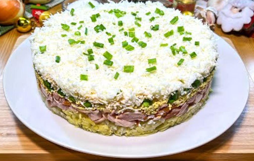 Ova slojevita salata je izuzetno kremasta, nežna i dekorativna – pravi izbor za Novu godinu, slavu, rođendane ili svečane prilike.