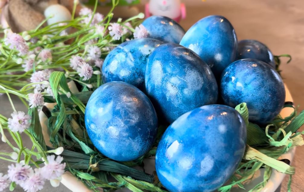 Jaja se kuvaju u vodi sa ljubičastim kupusom, solju i alkoholnim sirćetom, čime se postiže prirodna, intenzivna plavo-ljubičasta boja savršena za uskršnju dekoraciju.