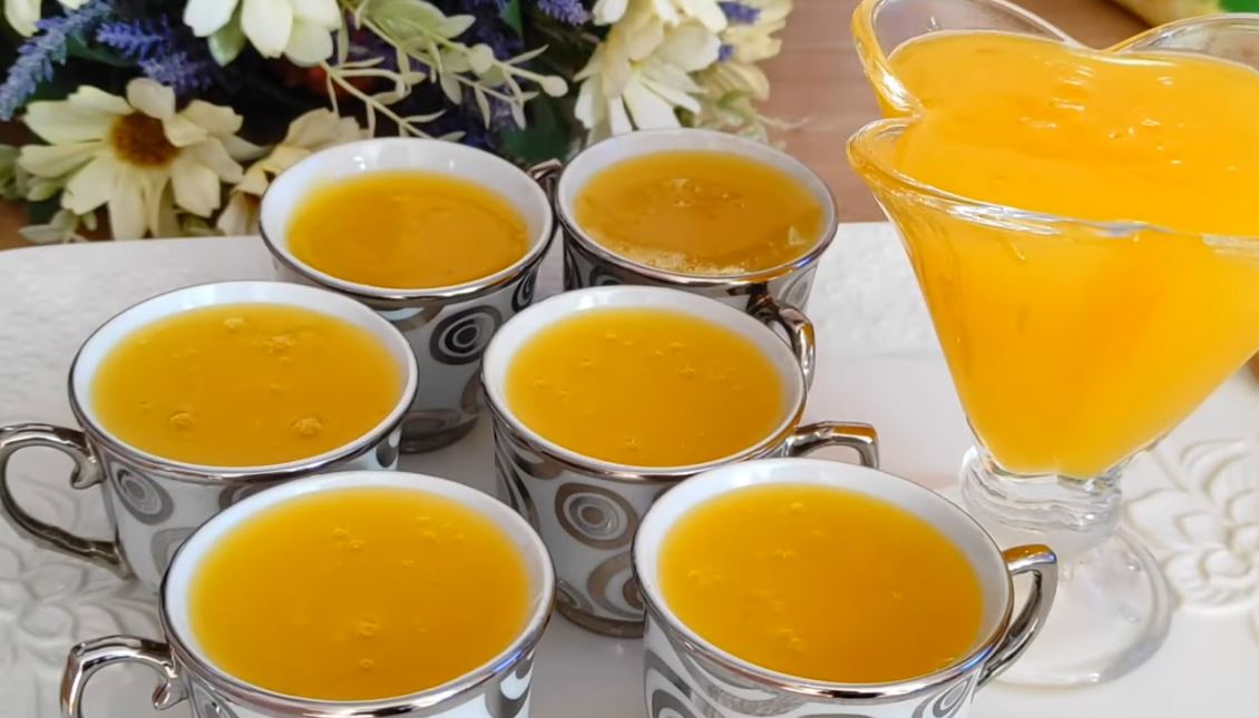 U šerpi pomešajte sok od narandže, gustin i šećer, kuvajte uz mešanje dok se ne zgusne, sipajte u činije i ostavite da se ohladi.