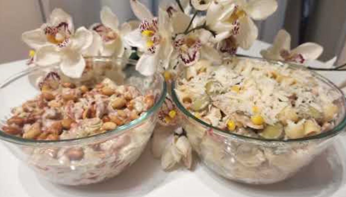Pomešaj sve sastojke za svaku salatu – jedna s makaronama, povrćem i tunjevinom, druga s kikirikijem, prazilukom i paprikom – i uživaj u bogatom, posnom ukusu!